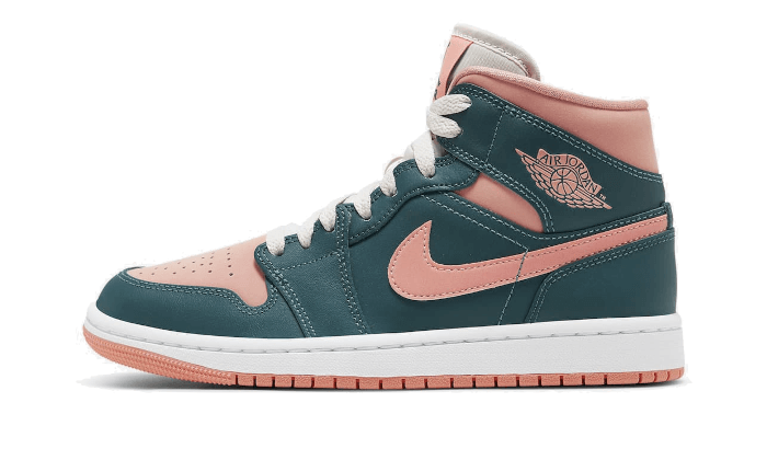 Là Air Jordan 1 Mid Buio Teal Green presenta una base in Pelle blu anatra ai vari pannelli di pelle rose come la toebox, il col e lo swoosh laterale. Una lingua beige è sollevato da Lacci bianchi rotti. Un’intersuola bianca con la suola rose lo finisce design tendenza.