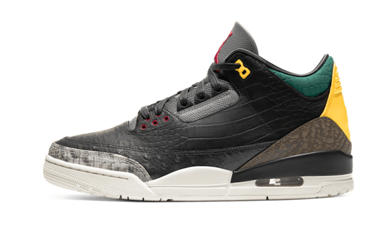 There Air Jordan 3 Retro Animal instinct 2.0 presents a textured black leather base sublimated by gray leather overlays at the front of the foot and another at the rear, presenting the essential printed Elephant Print. There are more colorful elements like an Empiècement in Sweden Green At the ankle level, a Jumpman red on the tongue while the heel reinforcement element and the first eyelets opt for YELLOW. Finally, a gray mesh tongue and a two -color sole come to refine the design.