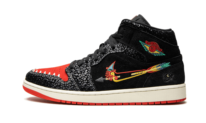 Là Air Jordan 1 Mid Siere Familia indossa una parte superiore camoscio nero alle sovrapposizioni in pelle verniciata a Pattern maculato Tono su tono. La toebox è adornata Suede rosso circondato da denti bianchi sulla parte superiore del parametro di fango, che rappresentano il giaguaro, animale che simboleggia la forza e il potere nel Mitologia amerindiana. Il ricamo che adorna il Swoosh e il tallone e il logo Ali Sul collare si riferisce alle radici Aztechi E Maya del popolo messicano. La classica crema per intersuola con suola rossa arriva perfettamente la silhouette.